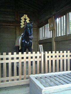 ♪三嶋大社にいる神馬は、毎朝、神様を乗せて、箱根山を登って来るそうな。そのため、健脚の神様とも知られ、お宮参りに来ていた親子3代の家族が、神馬の前で写真を撮っていた。元気で丈夫に育ちますように・・・